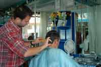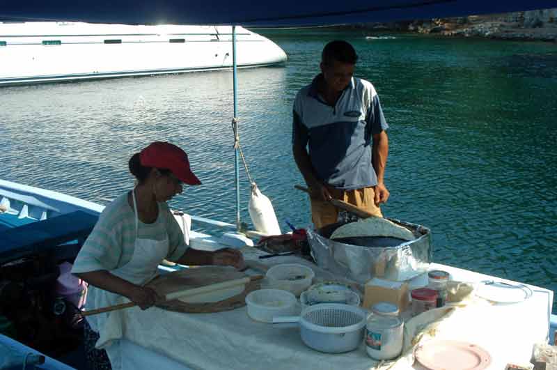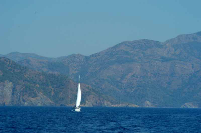 July 16: Wie head for Fethiye, Brigitte and Benedikt prefer another day in this nice bay. We are lucky we have very nice sailing wind. Now we get back what we had to fight against the last weeks. July 17: Rainer takes the opportunity and visits the Turkish hairdresser he knows from his visit in Spring. No wonder he prefers him over my hairdressing! Cutting, blowdrying, massage, shaving, facemassage, cleaning out the ears and what else! How can anymore make so much fuss about so few hairs! Later in the afternoon the "nice weather wind" arrives and takes us back to the Bauernbucht. At night it gets very crowded. It is unbelievable where a gulet squeezes in! July 18thi: Most of the gulets dissapear early in the morning. Now we have the bay for ourselves again and stay another day. For dinner we try the pancake boat and it is really tasty. |