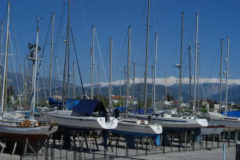 Mit Verspätung landen wir in der Nacht vom 9. auf 10.April 2007 in Antalya und dementsprechend sind wir früh am Morgen auf unserem Schiff. Man merkt, es ist erst Anfang April, auf den Bergen liegt noch Schnee. Dieses Jahr lassen wir die Arbeiten am Schiff (Abschleifen, Antifouling usw.) von einem Angestellten erledigen, das geht wesentlich schneller und kostet nicht die Welt. Mit Polieren und anderen notwendigen Arbeiten sind wir auch so hinreichend beschäftigt. Und so sind wir schon Ende der Woche im Wasser. Benedikt liegt schon seit ein paar Wochen am Nachbarsteg, dieses Jahr ohne Brigitte. |