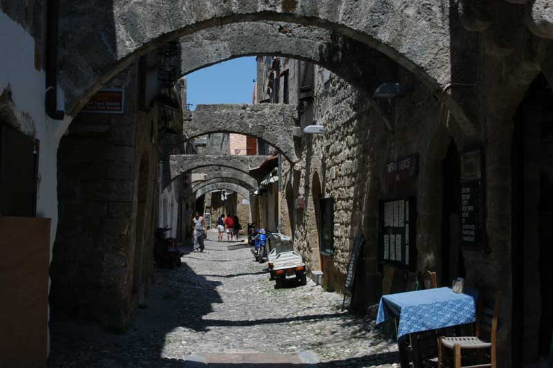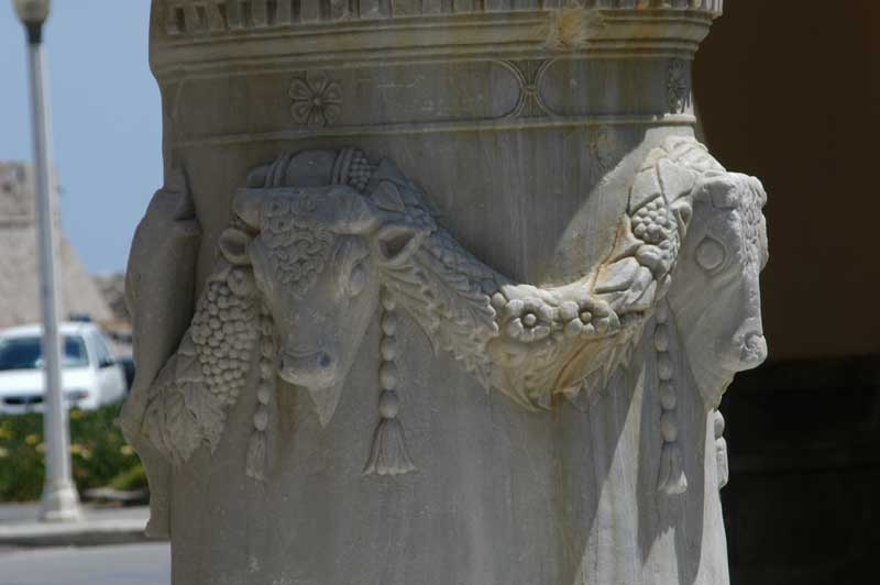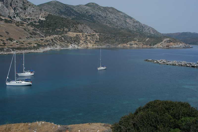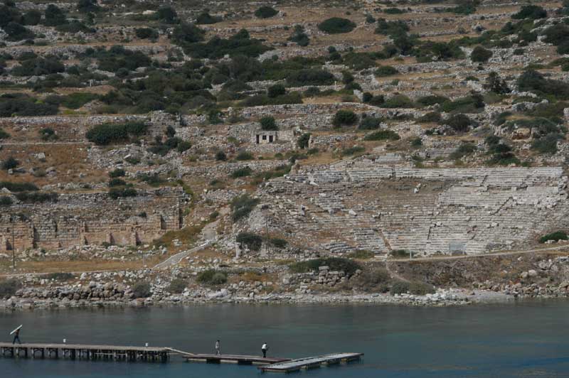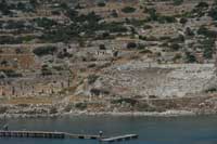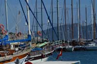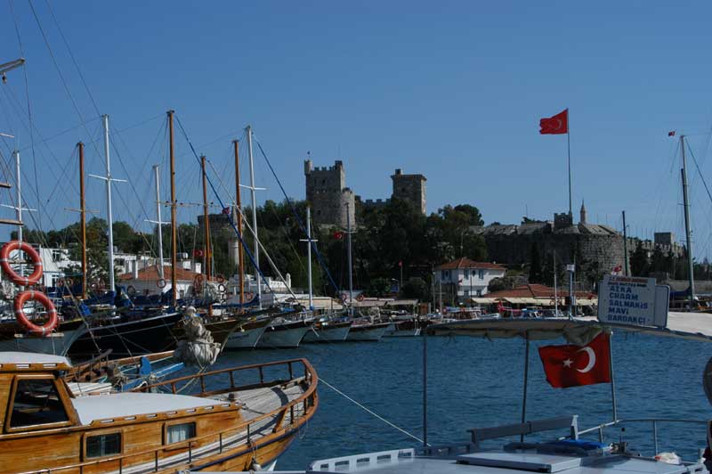 unfinished marina outside. No change in the last two years. Rhodes is still quite, to early for tourists. There is a German butcher of Rhodes and we enjoy potato salad and bratwurst. We stay three days and three nights then we head for Symi. The proposed wind of 3-4 beaufort turns into a 6-7. Fortunately the direction is concenient for our destination. The small harbour of Symi is quite crowded despite the early season. At night it starts to rain, we feel like sleeping in a tent. In the morning the sun is back again but the air is quite misty. With absolutely no wind we reach Knidos - very unusual in this area. The cape of the ancient city of Knidos is notorious for rough weather but obviously today we are lucky. The sea is absolutely flat when we drop our anchor in the "museum". Of course we want to visit the ruins but it is extremly hot and windless, so our walk is rather short. Heavy gusts from the rockface desturb our sleep during the night. And in the morning the strong wind of the cape is back. We should have rounded the cape yesterday! Now we have to figth till we are in Bodrum. The marina is very crowded, mostly with "Delaware Turks. To avoid Turkish taxes rich Turks register their boat in the US. We get a small berthing at the very end of the pier. The skipper doesn't feel well and dissapears in his bed. Next day we have to move to another berthing because they need this particular space. We have to do this even it is very windy. The box they squeeze us into is extremly small and our biggest and best fender pops by this action. The marineros feel guilty (quite right) and bring us another to replace the broken one. The skipper feels still very sick even he takes several pills to solve the problem. That's why I have to visit the nice city of Bodrum by myself. When there is no improvement in Rainer's condition the next day we call a doctor. He says exactly the same Jochen has said, only he charges 50 Euros for it. |
